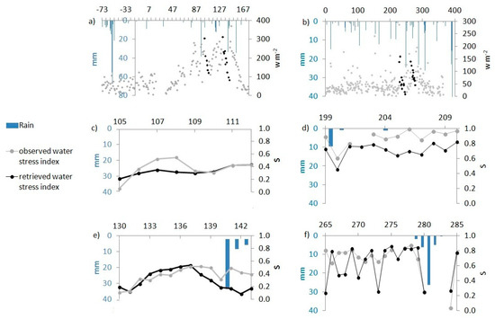 Evolution of the observed LE (W m−2) for (a) the wheat culture on Avignon in 2012 and (b) the Tunisian olive orchard in 2013. Drydown periods are indicated in black. Parts (c,e) represent the observed water stress estimate at 13:30 in grey and retrieved water stress estimates at 13:30 in black for each of the two dry-downs observed for Avignon wheat 2012 and (d,f) the same for the Tunisian olive orchard 2013. The thick line represents the daily accumulated rain. The x-axis referred to the day of year.