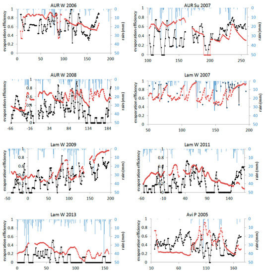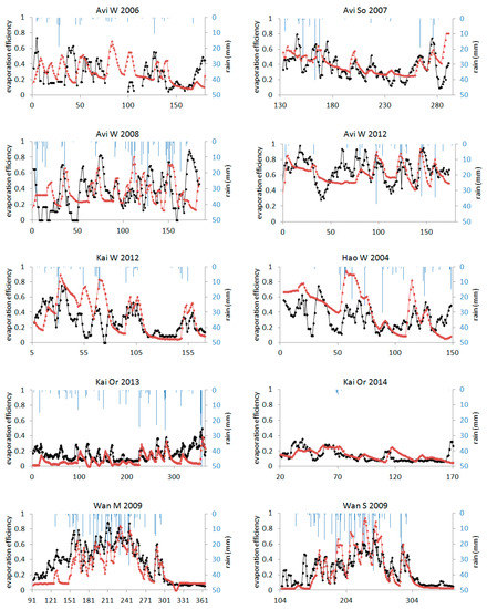 Evolution of the Soil Plant Atmosphere and Remote Sensing Evapotranspiration (SPARSE) layer retrieved evaporation efficiencies (black) compared to the empirical evaporation efficiency calculated using observed topsoil moisture βs−e (red) for the different sites and years (Table 1) where the 5-cm top soil moisture was acquired. Vertical lines represent the daily accumulated rain (right y-axis).