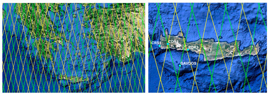 The Sentinel-3A Pass No.14 is an ascending pass, with groundtrack west of Gavdos. This means that just a few seconds before reaching from the south the CDN1 transponder Cal/Val site on the mountains, the satellite makes its way up north from the sea, but 10–15 km west of the Gavdos (Figure 12 left). Additionally, the descending Sentinel-3A Pass No.335, coming from the north, crosses at a point on the island where the Gavdos Cal/Val facility is located, at about 08:47:00 UTC every 27 days (Figure 12 right). At least two GNSS receivers, as well as three tide gauges, have been continuously operating at the Gavdos Cal/Val facility during these Sentinel-3A Passes. This helps maintain a high success rate for sea-surface calibrations (Figure 12).
