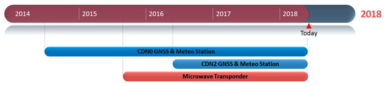 The main instrumentation at the CDN1 Cal/Val site includes a prototype range microwave transponder [8], two continuously operating GNSS stations, and two meteorological stations. The first GNSS receiver has been installed on site and has been operational as of June 2014, while the microwave transponder has been installed and operational as of 28 August 2015 (Figure 3).