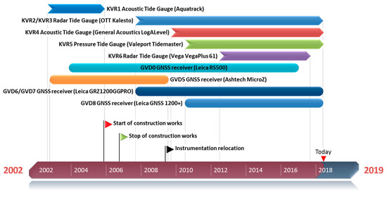 Since the initial setup in 2001, the instrumentation installed at this sea-surface Cal/Val facility in the Gavdos island has been modified throughout this long period of operation to (a) compensate malfunctions, failures, and damages caused by extreme weather events, (b) to follow up changes in satellite altimetry measuring techniques, and (c) improve the instrumentation’s uncertainty budget (Figure 5).