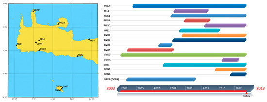 The regional GNSS network in Gavdos and west Crete, Greece (left) and availability of GNSS observations (right).