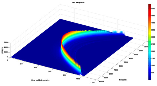 Figure 8. This is an example of the Sentinel-3A signal responses generated by the transponder at the CDN1 Cal/Val site on 21 December 2017, at the mountains of West Crete. Calibrated Synthetic Aperture Radar (SAR) data, shown as a Fast Fourier Transform, are plotted against zero-padded samples and Ku-pulse index in Cycle No.26 of Sentinel-3A. The Pulse Repetition Internal for Sentinel-3A has been 17,800 Hz within a burst and the burst repetition interval is 80 Hz. Relative scale of signal magnitude is shown in color on the vertical bar (arbitrary units).The measured altimeter range is given as the difference between the gate number (bin number) of the peak (maximum) of each pulse and the reference gate number set on the altimeter, multiplied by the actual “bin resolution” (in theory about 3.125 ns for the Ku-band pulse duration). For example, for Sentinel-3 the tracking point is gate 44, i.e., bin index is 43 for Ku-band, or gate 46, i.e., bin index 45 for C-band, as measuring starts from bin index zero (index = 0). Nonetheless, the effective range resolution with which the actual range is to be determined by the altimeter is driven by the width of the point target response recorded with 3dB, and included in its “Autocal” mode [23]. The measured altimeter distance between the satellite and the transponder, is given by:where is the altimeter distance from the satellite to the Earth’s surface corrected for instrumental delays, such as Ultra Stable Oscillator frequency drift, internal path correction or Doppler correction (Called “tracker range”), is the bin number of the maximum signal return by the transponder, is the reference bin number, c is the speed of light, and is the pulse duration in seconds. The altimeter range bias is computed as measured minus theoretical altimeter range after corrections are applied. - Corrections on the observed range. The altimeter range Rm, as reckoned in the previous step, is corrected for the following quantities: (a) troposphere and ionosphere delays caused by the atmosphere onto the altimeter’s signal; (b) difference between the satellite’s center of gravity and the altimeter’s effective center of measurement; (c) drift of the Ultra Stable Oscillator in the altimeter; (d) internal delays of the associated instruments as the echo travels back and forth; (e) geophysical corrections (i.e., solid earth tides, etc.) at the transponder location; (f) Doppler correction from both altitude rate and velocity of the satellite.