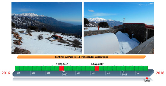 Timeline of Sentinel-3A Pass No.14 transponder calibrations at the CDN1 Cal/Val site. Green boxes represent successful calibration, whereas red boxes correspond to two calibrations canceled as a consequence of extreme weather conditions (4 January 2017, Cycle No.13, Images above) and site maintenance (8 August 2017, Cycle No.21).