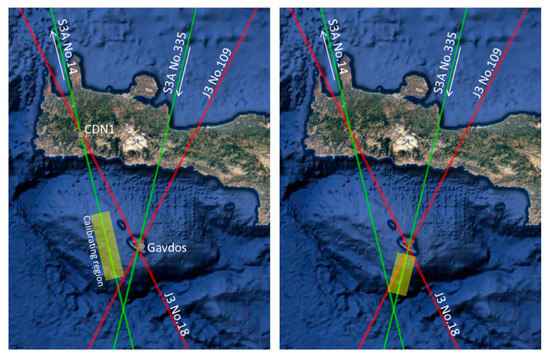 The shaded greenish areas represent the Sentinel-3A Pass No.14 (left, ascending) and Pass No.335 (right, descending) calibrating regions at the Gavdos sea-surface Cal/Val site.