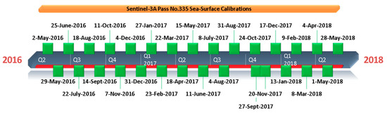 Timeline of Sentinel-3A Pass No.335 sea-surface calibrations at the Gavdos Cal/Val site in west Crete, Greece. The green boxes illustrate days of satellite overpass and availability of sea-surface heights by the in-situ scientific instruments.