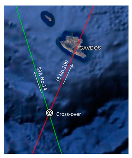 Additionally, a crossover analysis has been carried out with nearby cross-over points in the vicinity of the PFAC Cal/Val sites. The Sentinel-3A Pass No.14, for example, intersects with Jason-3 Pass No.109 about 20 km south of Gavdos (Figure 13). The analysis involves the examination of the sea-surface heights, as estimated by Sentinel-3A and Jason-3, when they overpass that crossover location within a window of ±3 days [34].