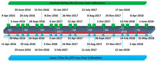Dates of the crossovers as of April 2016 for both missions are briefly shown in Figure 14. An analysis of the sea-surface heights as estimated by the Sentinel-3A and Jason-3 altimeters at this crossover location indicates that Sentinel-3A measures heights higher than Jason-3 (i.e., S3A-JA3) by about +4 cm with a standard deviation for the estimated mean as ±8 cm. Results for this crossover analysis have also been reported in [35].