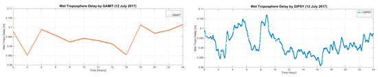 An example, of the Zenith Wet Troposphere Delay in mm as derived by GNSS processing with GAMIT (left) and GIPSY (right) scientific software for 12 July 2017 at the transponder CDN1 Cal/Val site.