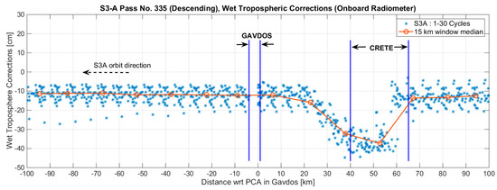 The wet tropospheric corrections (WTC) as produced by Sentinel-3 radiometer, along Pass No.335, have been compared against corrections derived by GNSS processing. Satellite measurements that are flagged as invalid have not been taken into evaluation. The individual radiometer WTC profiles along-track of each cycle of Sentinel-3A have been plotted with respect to distance from the point of closest approach in Gavdos and are shown in Figure 16. The central red line represents a moving median within a window of 15 km of radiometer values as a function of distance. Positive distance denotes north of Gavdos, while negative distance stands for locations south of Gavdos.