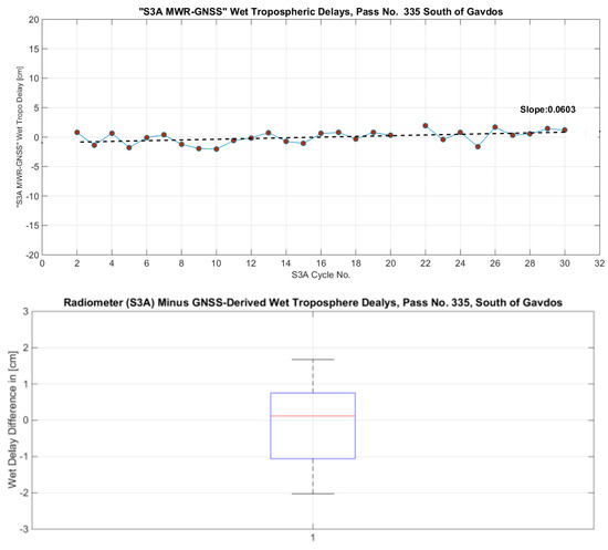 Then, the wet tropospheric delays, as determined by the S3A radiometer, were compared against those derived from the GNSS monitoring stations in Gavdos. Comparisons have been made between the last valid value of the radiometer, about 15–20 south of Gavdos (depending on the S3A pass), and the value produced at the reference GNSS sites in Gavdos, at the same time. It seems that there is an upward trend in the plot of Figure 17 with a slope of +0.0603 cm/cycle (98% significance). The average value of that difference in the wet troposphere delays comes to −0.09 cm, a value very close to zero. The standard deviation for its average is ±2 mm. Additionally, a certain larger number of differences seem to be negative rather than positive (lower plot of Figure 17, asymmetrical distribution of differences with respect to central location, i.e., median). The Root-Mean-Square value is estimated to be +1.06 cm. This RMS error of the observed satellite WTD is in agreement with values presented elsewhere [36,37].