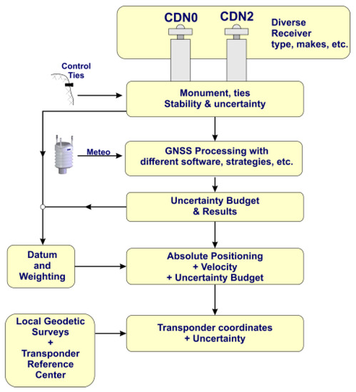 Absolute coordinates for the transponder were supported by two continuously operating GNSS stations and by periodic geodetic and local surveys at the CDN1 Cal/Val site. Final coordinates for the transponder reference center were delivered after diverse GNSS processing (different receiver makes, processing, and procedures) was carried out, along with a weighting mechanism depending on component uncertainties. Figure 18 shows the two GNSS stations of CDN0 and CDN2 and the way final positioning results were produced for the transponder reference center. Atmospheric delays were derived through GNSS processing and at the time of satellite overpass.