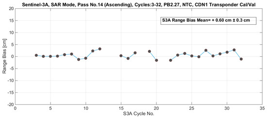 Absolute range bias results for the ascending Sentinel-3A Pass No.14, Cycles 3–32 at the CDN1 Cal/Val site.