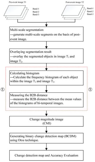 The aim of the proposed MOHD lies in measuring the change magnitude through a spectral frequency distribution histogram of pairwise multi-scale objects. As shown in Figure 1, the proposed MOHD approach is composed of the following steps. (1) Multi-scale segmentation algorithm is applied to extract multi-scale objects based on the post-event image. Each object is then taken as a local region to extract histograms from the corresponding geographical area of bi-temporal images. (2) Histogram feature vector of the bi-temporal image is defined based on the frequency and spectral distribution. (3) B2B distance is promoted based on the definition of arithmetic frequency-mean feature (AFMF). In the following sections, details of the proposed MOHD are given when the change magnitude between bi-temporal images is calculated object-by-object and Otsu binary threshold is employed to divide the CMI into BCDM.