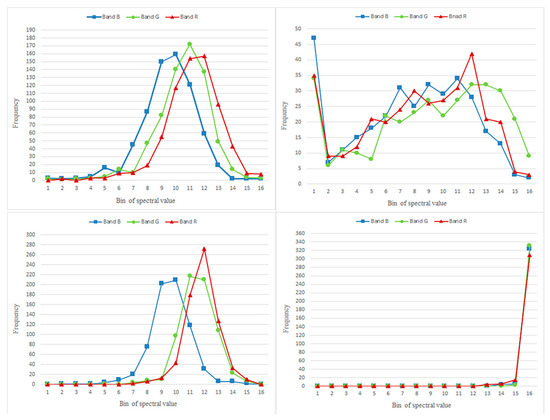 where is the AFMF spectral histogram feature of the histogram . In the preceding definition, is the frequency of the k-th bin of the histogram , and is the middle spectral value of the k-th bin. In addition, k is the count of bins for the histogram, with k ranging from 1 to 16. is the total number of pixels within the object . From the proposed defined equation of histogram feature, indicates the mean expectation of the histogram, which is related to a group pixel within an object. In this manner, the mean spectral histogram feature for the R-G-B band can be obtained, and the feature vector can be given as . Similarly, the feature vector for the other histogram is .
