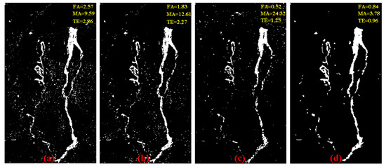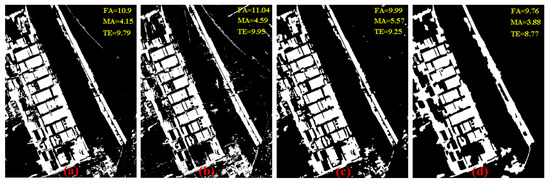 Binary change detection results with different LCCD methods for dataset A: (a) LSELUC [4]; (b) PCA-Kmeans [29]; (c) MAC-OBCD [32]; (d) the proposed MOHD approach; the accuracies of FA, MA and TE are presented in percentage (%).