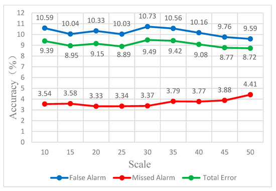 To further investigate the relationship between segmentation scale and detection accuracy, we obtained a series of detection results using our proposed method with different scale parameters of multi-scale segmentation. Given that segmental objects with high homogeneity and regular shape are expected, the parameters of compactness and shape were fixed at 0.8 and 0.9, respectively. Under this context, Figure 8. shows the relationship between segmentation scale and detection accuracy for dataset B. The figure reveals that segmentation scale has a slight effect on the detection accuracy because it affects the number of segmental objects. Nevertheless, the inherent shape, structure and size of a given target will remain even when the number of segments for compositing vary. This is the fundamental characteristic of the multi-scale segmentation method [43]. For example, regardless of whether the area of a building in the image is depicted by different numbers of segmental objects, the shape, boundary and size will still be preserved and described by these different scale objects.