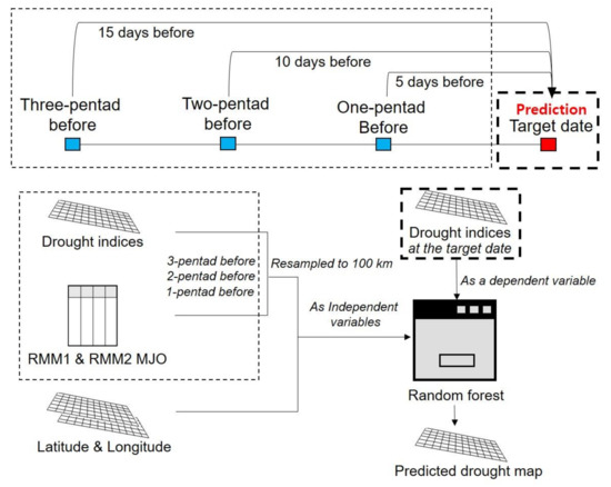 A total of 11 input variables were used to develop the drought prediction models: 1-, 2-, and 3- pentads before the target prediction dates, RMM1 MJO, RMM2 MJO, and drought indices, latitude, and longitude—from 2000 to 2016 (Table 1). The target variable is each drought index. For example, to predict SDCI on a target date, SDCIs computed 1-, 2-, and 3-pentads before the date was used with other variables, i.e., 1-, 2- and 3-pentad before RMM MJO indices, latitude, and the longitude of each pixel over the study area. Figure 2 shows the process flow diagram of the approach proposed in this study. All variables—drought indices, RMM MJO indices, latitude, and longitude—were resampled to 100 km, considering the characteristics of the variables over the entire study area by using all pixels. Then, the 11 independent variables were fed into a random forest to develop drought prediction models to predict each drought index for the target dates. A randomly selected 80% of the samples were used as training data, and the remaining 20% were used for validation. Validation was conducted to compare the performance of each drought index and the effect of MJO for the short-term prediction of drought, and to identify the importance of the input variables. Then, a ‘leave-one-year-out’ cross validation was used to further evaluate the selected drought prediction model.