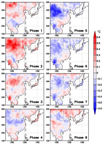 Composites of 30–90 days filtered surface air temperature (SAT) based on each of eight MJO phases during 22 spring seasons (April–May) of 1991–2012. Dashed rectangles indicate the domain of northeast Asia.