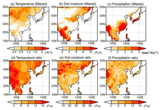 Figure 4 represents the daily variance of the SAT, near-surface (~10 cm) volumetric soil moisture, and precipitation on a sub-seasonal timescale of 30–90 days. The sub-seasonal variance of the SAT is about 1 °C2 over central China (90°E–120°E, 35°N–50°N) where the land surface conditions are relatively dry, and the range of soil moisture variance on that timescale is about 10%2 over south-east Asia (90°E–110°E, 10°N–25°N) and north-east Asia (110°E–140°E, 35°N–50°N). Precipitation variability on a sub-seasonal timescale is high in the main rainfall regions including south-east Asia, south China, Korea, and Japan. However, the distribution of the ratio explained by the intra-seasonal variation versus the total variance is quite different. The degree of explanation of the soil moisture variability on the range of 30–90 days compared to its total variance is practically high, about 40% over central and north-east China, where soil moisture memory is relatively large compared to the rest of East Asia [66]. The ratio of the filtered temperature variance to its total variance is about 10–15% over the research region, and the ratio of the precipitation is less than 10%. Based on the introduced variables, this study examines their role in forecasting drought in a short period of time over East Asia.