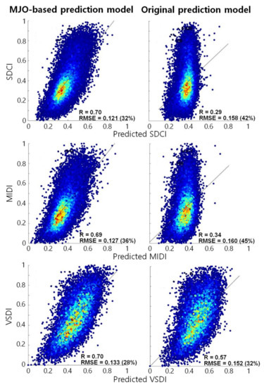Figure 5 shows the 8:2 validation results. The MJO-based prediction models showed better performance than the original prediction models (i.e., without MJO variables) (Figure 5). The correlation coefficients (r) and RMSEs were greatly improved by around 0.3 and 10%, respectively, in all three drought indices. Figure 5 also shows that the predicted drought indices in the MJO-based prediction models are well matched with the actual drought indices. For SDCI and MIDI, the values of the predicted drought indices are concentrated on mean values (~0.35) in the original prediction models, which results in a smaller dynamic range (0.2–0.5). Such a tendency has previously been reported to be one of the limitations of empirical models in many studies [49,67]. However, predicted drought indices catch the range of the original drought indices well (0.1–0.7) in the MJO-based prediction models. In particular, the driest and wettest conditions in SDCI and MIDI were predicted well, which shows that RMM MJO indices provide useful information for drought prediction. Supplementary Figures S1–S3 show the time series of the predicted and target drought indices for six selected points (Point 1: 17°N and 80°E; Point 2: 34°N and 102°E; Point 3: 42°N and 123°E; Point 4: 47°N and 102°E; Point 5: 48°N and 83°E; and Point 6: 49°N and 112°E). The drought pattern fluctuates in the short term (i.e., one pentad). Although the predicted indices did not have the full dynamic ranges of the target indices, the predicted ones, particularly the predicted VSDI, showed a relatively similar pattern to the targets. The correlations between one- to three-pentad lagged drought indices and the target indices were mostly lower than those between the predicted drought indices and targets (Supplementary Table S1). Although the R2 values of the prediction models seem to be relatively low, the results show that the short-term drought prediction using the proposed VSDI method is necessary and useful when compared to the existing indices.