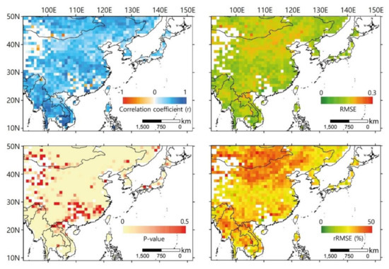 Figure 6 shows the spatial distribution of the 17-fold (leave-one-year-out) cross validation results of the MJO-based VSDI prediction model. The Original VSDI and predicted VSDI during the planting season (April to May) from 2000 to 2016 (153 pentads) were compared using r, the p-value, RMSE, and rRMSE (Figure 6). According to the results, positive correlation (~0.424) and low RMSE (<0.148) and rRMSE (<30%) can be seen in most areas. Some regions, such as southern and north-western China, showed lower r and a higher p-value than other regions, which implies that the drought prediction model did not predict VSDI well in these areas. This is because of the limited number of samples due to clouds (i.e., no data pixels in LST and NDVI) and limited satellite paths (CCI soil moisture). North-eastern China near the Gobi desert shows higher RMSE (~0.18) and rRMSE (~40%) with relatively low r (~0.23) compared to other areas, because this region is sparsely vegetated and is relatively dry (averaged VSDI ~0.411) regardless of the season, unlike the other areas (averaged VSDI ~ 0.523) [67]. The drought prediction model performed well over densely vegetated regions, which consist of forest, shrublands, savannas and croplands (refer to Figure 1) with relatively high r and low RMSE and rRMSE (Figure 6).