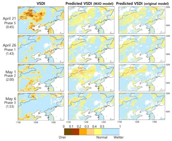 Although the spatial pattern of the predicted VSDI was well matched with actual VSDI, the severity of the drought in the predicted VSDI was relatively overestimated. The dynamic range of the predicted VSDI was slightly smaller than that of the actual VSDI because random forest tries to produce results with fewer errors, which leads to the values trending closer to the mean value when there are not many extreme samples [13,49]. Although it is difficult to predict a sudden change in drought conditions (wet to dry or dry to wet) considering only the previous patterns of droughts [25,69,70], the MJO-based prediction models can improve on that limitation. In particular, MJO-based prediction models are very useful in predicting drought with high resolution (5 km) in a short period of time.