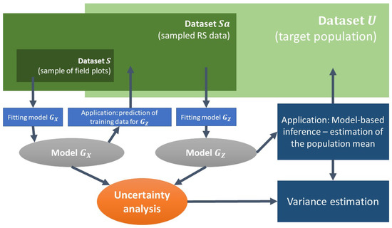 - The first dataset, denoted S, contains a sample of field data for which sampled RS data are also available. The dataset is used for estimating the model parameters . Each estimator based on this set is given the subscript S; the data S comprise n field observations.