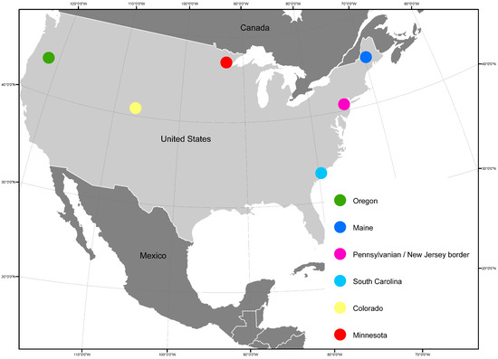 LiDAR data were collected using a Riegl LMS-Q680i system at five sites (SC, PANJ, ME, MN, CO) in the summer of 2014 and a sixth site (OR) in the summer of 2015 (see Figure 2 for locations and Table 1 for site descriptions). All data were collected during snow-free time periods when vegetation was fully leaf-on and non-senescent. The data was collected in north-south oriented flight lines spaced 5 km apart. Some crossing flights were flown for calibration purposes. Technical specifications for the LiDAR acquisition included: point density of 4 pulses per square meter; altitude of 732 m; field of view of 60 degrees; pulse rate of 330 kHz; nominal swath width of 812 m; horizontal and vertical accuracy (root mean square error in z) of 50 cm [33]. The LiDAR data were processed in Fusion [43] to produce rasters of various metrics with a 30 m cell size to support the plot selection process described below.