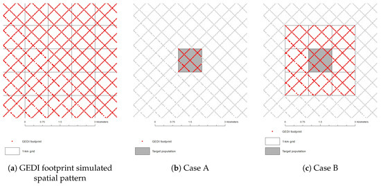 (a) Simulated spatial pattern of GEDI footprints and the 1-km grid delineation; (b) Case A: data for a single 1-km grid-cell were used; (c) Case B: data from neighboring grid-cells were used as well, for the GHMB and GTSMB estimators.