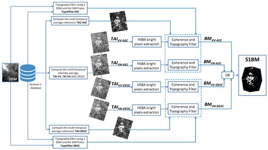 - Merge the four separate resulting buildings maps, , , , and , to obtain the final S-1 Buildings Map (S1BM).