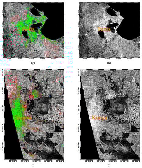 - TAI VH-ASC & -DESC ( and ): these features are obtained as in (a) but we consider the cross-polarization channel, which is better suited for detecting buildings with a dihedral shape that are not perfectly aligned with the orbit orientation.