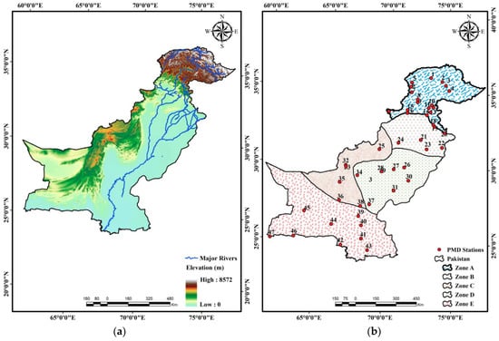 The Indus River is the most important river in Pakistan. The Indus River originates from Mount Kailash in Tibet (China) and discharges into the Arabian Sea. The Indus River covers most of Khyber Pakhtunkhwa, Punjab and Sindh provinces of Pakistan, with the Himalayan mountains (North–East) and Highland regions in the north and the arid regions in the southwest. Salma et al. [49] divided Pakistan into five different microclimate zones (Figure 1).