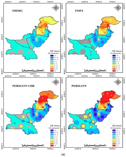 The ME results (Figure 2a) indicated that all the SPPs performed poorly in Zone-A (considerable overestimation of precipitation except at Parachinar SPG) as compared to the other zones. This error may be associated with the fact that in the glacial region, the presence of ice cover and cold cloud contribute to the overestimation [58,59]. Generally, the magnitude of ME shows a decreasing trend from North to South of the country. All the satellite performed well in Zone-E (slight underestimation) which is coastline area with relatively low elevation and rainfall intensity. Moreover, the performance of all SPPs is good in the Zone-C and Zone-B while moderate in Zone-D. Among all the SPPs, IMERG product showed significantly improved performance followed by TMPA. Higher ME (ME > 40 mm/month) is observed over Murree, Muzaffarabad, Dir, Drosh, etc., while smallest ME is observed at Jiwani and Badin SPGs.