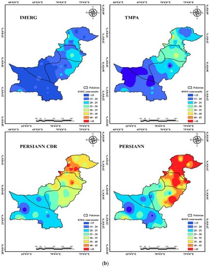 Figure 2b indicates that RMSE is showing a similar trend to ME: higher RMSE at Zone-A and lower RMSE at low altitude climate zones. However, the RMSE of Zone-D is slightly higher compared to Zone-C and Zone-D. Maximum RMSE is observed at Drosh, Dir, and Balakot while minimum RMSE is observed at Larkana and Panjgur SPGs. Considering the Zone-D (a special scenario), maximum RMSE is observed at SPGs namely Khanpur and Bahawalpur, revealing the poor performance of satellite SPPs at those SPGs. Similar observations are found in the study conducted by Yawar [43], where RMSE is decreasing from North to South. The maximum RMSE associated to IMERG is 29.23 mm/month at Drosh SPG, while for TMPA the maximum RMSE is 38.50 mm/month at Dir SPG. For PERSIANN and PERSIANN-CDR maximum RMSE is observed Dir (65.14 mm/month) and Balakot (55.9 mm/month), respectively.