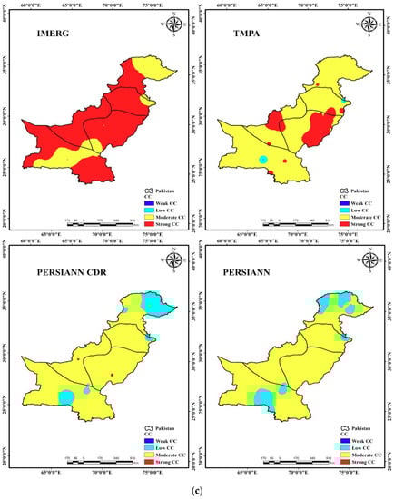 The performance evaluation based on CC (Figure 2c) revealed that IMERG agreed well with the majority of SPG observations as compared to TMPA, PERSIANN, and PERSIAN-CDR. The results revealed that IMERG performance is good over the Zones-B, C, and D, and average performance over Zone-A and Zone-E. IMERG shows high correlation with Bahawalpur SPG in Zone-D followed by Karachi airport (Zone-E), and Faisalabad (Zone-B) while relatively poor performance at Lasbella (Zone-E) and Sialkot (Zone-B) SPGs. However, TMPA has a high correlation with Khanpur (Zone-D), Faisalabad (Zone-B), and Karachi airport (Zone-E) SPGs while lower performance in Lasbella (Zone-E), Sialkot (Zone-B), and Dir (Zone-A). Overall, the results indicated that the performance of IMERG outperformed all other satellites over most of the SPGs.