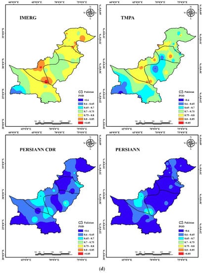 The selected SPPs, i.e., IMERG, TMPA, and EP algorithm, were evaluated for the four seasons: pre-monsoon (April, May, and June), monsoon (July, August, and September), post-monsoon (October and November), and winter (December, January, February, and March) over Pakistan. Pakistan receives a higher percentage (60%) of precipitation during the Monsoon season (July to September). The monsoon precipitation varies spatially in magnitude from low (around 100 mm) in the south (24–28°N), higher (>700 mm) in the northeast (29–33°N), and again low (<100 mm) in the far north (glacial region, 34–36°N) [11].