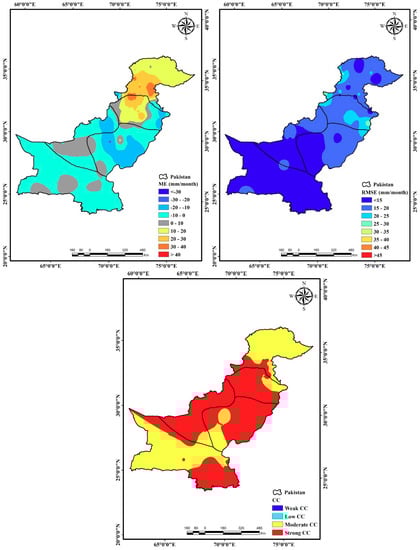 The selected four SPPs are quantitatively evaluated by comparing the SPPs with the daily PMD SPG observations from January 2015 to December 2016. The statistical indices used to assess the efficacy of selected SPPs are listed in Table 2, including (i) Mean Error (ME) to evaluate the bias, (ii) Root Mean Square Error (RMSE) to evaluate the magnitude of error with more emphasis on large errors as compared to ME, and (iii) the Pearson correlation coefficient (CC). For comprehensive evaluation of CC, the CC ranges mentioned by Iqbal and Athar [10] are considered: Weak (CC < 0.25), Low (0.25 < CC < 0.5), Moderate (0.5 < CC < 0.75), and Strong (0.75 < CC < 1).