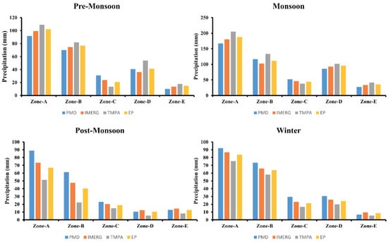Moreover, during the Monsoon season, IMERG closely predicted the precipitation in all the climate zones while TMPA highly overestimated the heavy precipitation in Zone-A and other plain areas and underestimated the precipitation in Zone-C. The EP algorithm slightly overestimated the precipitation in Zone-A while performed well in plain areas. In the post-monsoon season, both the IMERG and TMPA underestimated the precipitation across all the five climate zones except Zone-D and Zone-E. Moreover, EP algorithm closely predicted the precipitation in the plain area, however, overestimated the precipitation at elevated zones. While in the winter season, IMERG and TMPA underestimated the precipitation in all climate zones except Zone-E and Zone-C, respectively. On the other hand, the EP algorithm performed poorly in Zone-C while high performance is observed over other four climate regions. Overall, IMERG showed high performance in capturing heavy precipitation and relative lower performance in moderate/low precipitation seasons. The EP algorithm performed very well in plain areas irrespective of the season and showed relatively poor performance over mountainous regions. TMPA highly overestimated the heavy precipitation and underestimated the moderate/lower precipitation.