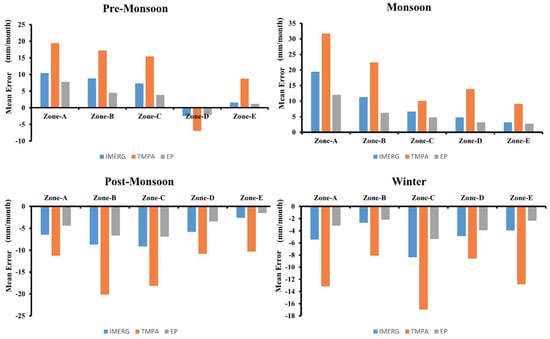 Mean error (ME) of satellite products and EP algorithm during the pre-monsoon, monsoon, post-monsoon and winter seasons.