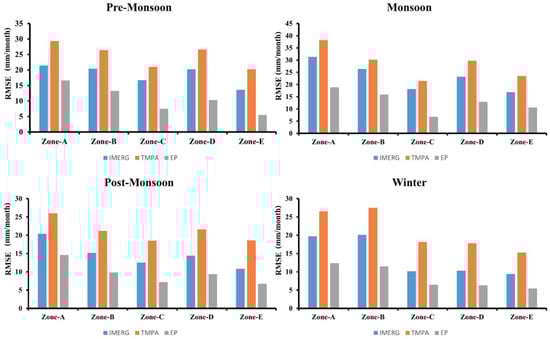 Root mean square error (RMSE) of satellite products and EP algorithm during the pre-monsoon, monsoon, post-monsoon, and winter seasons.