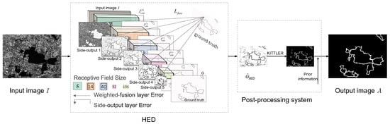 A post-processing system is added to modify the HED algorithm. The modified HED can output the binary edge map A of the input image I. The structure of modified HED is shown in Figure 1; it consists of the original HED and a post-processing system. Before discussing the post-processing system, we first introduce HED.