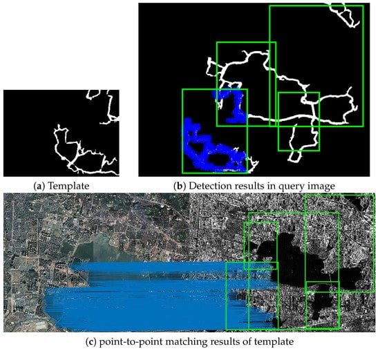 Finally, FDCM sets the matching cost threshold and obtains the results of the shape detection, as shown in Figure 2. Figure 2a shows the template, and the green box in Figure 2b represents the matched shape location. The locations of each point and its nearest edge point in V are output; and then, these points are matched one by one. In Figure 2b, the blue points show the nearest edge points of . Figure 2c shows the point-to-point matching results of this template and query image on the optical and SAR images.