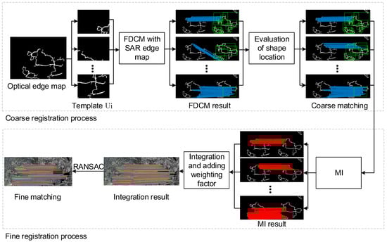 A mesh grid strategy is employed to perform a coarse-to-fine image registration, as shown in Figure 3. The upper part of Figure 3 shows the coarse registration process. In this process, the optical edge map is first divided into N templates; then, FDCM is introduced to obtain the matching points between the SAR edge map and the template. After estimating the matching points of all the grids, the wrongly detected shape locations can be corrected and the coarse matching result is obtained. The lower part of Figure 3 shows the fine registration process. In this process, MI is introduced to fine-tune the coarse matching result; then, matching points are integrated, and a weighting factor is added to each grid. Finally, RANSAC is introduced to obtain a fine matching result.