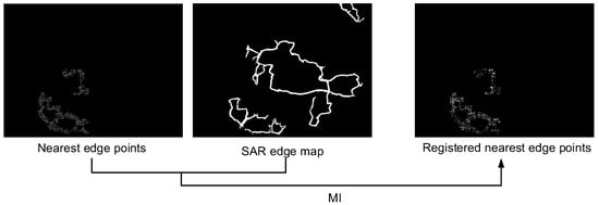 Second, as the nearest edge points’ locations are known, MI is introduced to register the nearest edge points and their corresponding region in the SAR edge map, as shown in Figure 4. Thus, we can calculate the nearest coordinates after the transformation, and we denote them as . Third, we add a weighting factor to each grid. For each template , if there is no correct matching location for all of the detection boxes in B obtained by FDCM, we set ; otherwise, , and the matching points in optical edge image A are