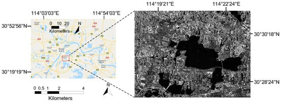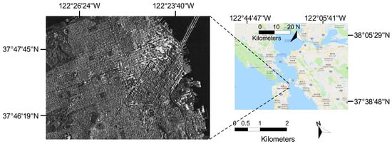 In the registration experiments, three sets of data are used to evaluate our proposed method, and details of these tested images are listed in Table 1. For Data Set 1, the study area is within Wuhan City, Hubei Province, China. The SAR image are single polarized (VV channel) data acquired by the TerraSAR-X, its near incidence angle is 34.074 degree, and the far incidence angle is 35.486 degree, as shown in Figure 6. The scaling difference between tested images is close to 10 times and the time interval is nearly 9 years. The SAR image of Data Set 2 is presented in Figure 7, it is single polarized (HH channel) Terra-SAR data acquired in San Francisco, the United States, the near incidence angle is 39.557 degree and the far incidence angle is 40.162 degree. The tested images are captured with a difference of 7 years. For last set of experiment data, the SAR image has the same resolution, incidence angle and acquisition time with the SAR image of the first data set, the specific location is shown in Figure 8. The resolution between tested images is nearly 5 times and the time interval reaches 9 years. The optical images of these three experiment data sets are downloaded from Google Earth, they are displayed in Figure 9.