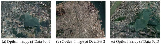 In this section, we first show the three sets of optical and SAR images which are designed to evaluate the proposed method. Then, the output of the intermediate steps of the algorithm and the final registered images are displayed. Finally, the matching correctness of feature points and the root mean square error (RMSE) [] of registered images are calculated to evaluate the accuracy and robustness of our proposed algorithm.
