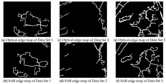 To analyze the matching results, comparing the optical images and the SAR images in the three sets of data may be helpful. For Data Set 1, there is a gradient change in the middle of the image caused by illumination or other imaging conditions, thus, the feature detector tends to extract the extra lines. Brightness changes also exists in the optical image of Data Set 3. For Data Set 2, the straight-line features are obvious, and the geometric distortion is very small, while the straight-line edges of the first set of data and the third set of data are not obvious. For Data Set 3, there are geometric distortions between the optical and SAR images. In fact, intrinsic and distinct differences exist in the optical and SAR images, with time interval and resolution differences in testing images added, registration becomes more difficult.