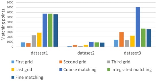 The matching points obtained from the distinct grids are calculated as shown in Table 2; the number of the matching points in each grid, the matching points obtained by coarse matching and fine matching, and the number of integrated matching points before RANSAC are listed. For Data Set 1, the matching results of each grid are evaluated, and the correct matching result of the 2-nd grid is determined; then, MI is used to fine-tune the coarse matching result and the weighting factor is calculated, . For Data Set 2, we set , . For Data Set 3, we set , . Figure 11 depicts the statistical results of the three sets of data.