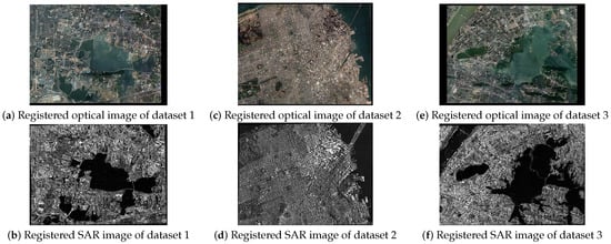 Image registration is the process of matching and overlaying two images obtained at different times, from different sensors or under different conditions, such as the weather, illumination, camera position and angle []. Image registration has been widely used in remote sensing data analysis, computer vision, image processing and other fields. Compared with single-sensor image data, multi-sensor data can provide more abundant information and can describe the original target more completely and objectively. Synthetic aperture radar (SAR) can obtain images at any time of the day and night independently of the weather conditions. SAR has a larger detection range than that for collecting optical images and can find targets that are not easily discovered by optical sensors. Although optical images contain richer spectral information, they are greatly influenced by external conditions such as the weather and atmospheric conditions. In some applications, using only one kind of data set usually results in limitations []. In contrast, the registration of optical images and SAR images uses the advantages of both data types to obtain complementary information, which makes it easier to detect and identify the object of the image and has greater accuracy [].